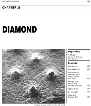 Chapter 36 from the Brazing Handbook. Contents for this chapter include - Introduction, Base Materials, Interaction of Diamonds with Liquid Metals and Alloys, Brazing Filler Metals and Brazing Processes, Applications, Bibliography, and Suggested Reading List.