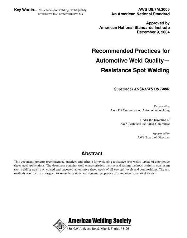 D8.7M:2005 RECOMMENDED PRACTICES FOR AUTOMOTIVE WELD QUALITY RESISTANCE SPOT WELDING (WITHDRAWN)