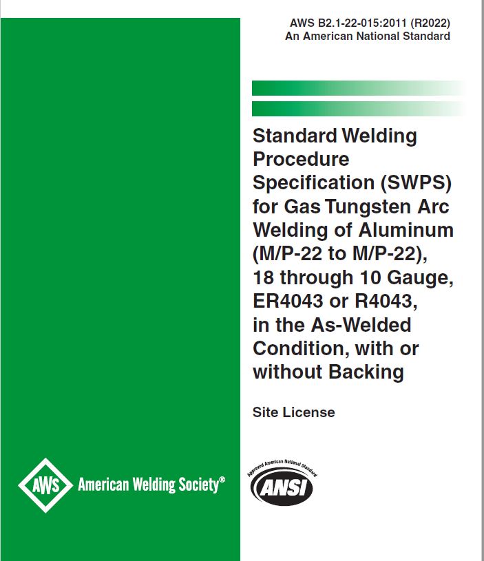 B2.1-22-015:2011-R2022 STANDARD WELDING PROCEDURE SPECIFICATION (SWPS) FOR GAS TUNGSTEN ARC WELDING OF ALUMINUM, (M/P-22 TO M/P-22), 18 THROUGH 10 GAUGE, ER4043 or R4043, IN THE AS-WELDED CONDITION, WITH OR WITHOUT BACKING