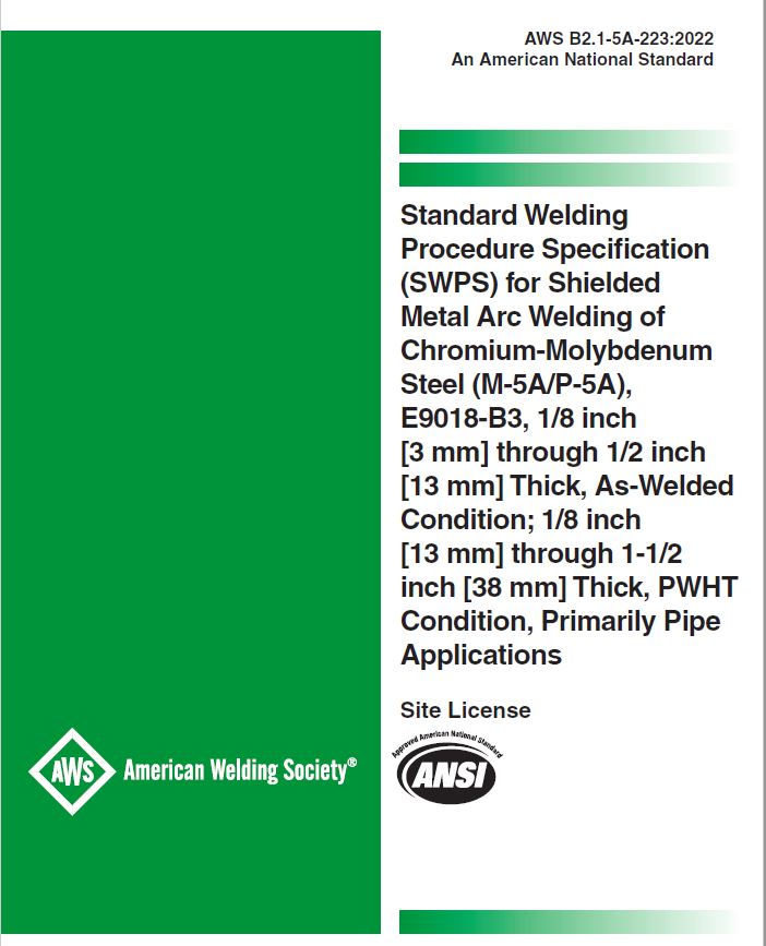 B2.1-5A-223:2022 STANDARD WELDING PROCEDURE SPECIFICATION (SWPS) FOR SHIELDED METAL ARC WELDING OF CHROMIUM-MOLYBDENUM STEEL (M-5A/P-5A), E9018-B3, 1/8 IN THROUGH 1/2 IN THICK, AS-WELDED CONDITION; 1/8 IN THROUGH 1-1/2 IN THICK, PWHT CONDITION, PRIMARI
