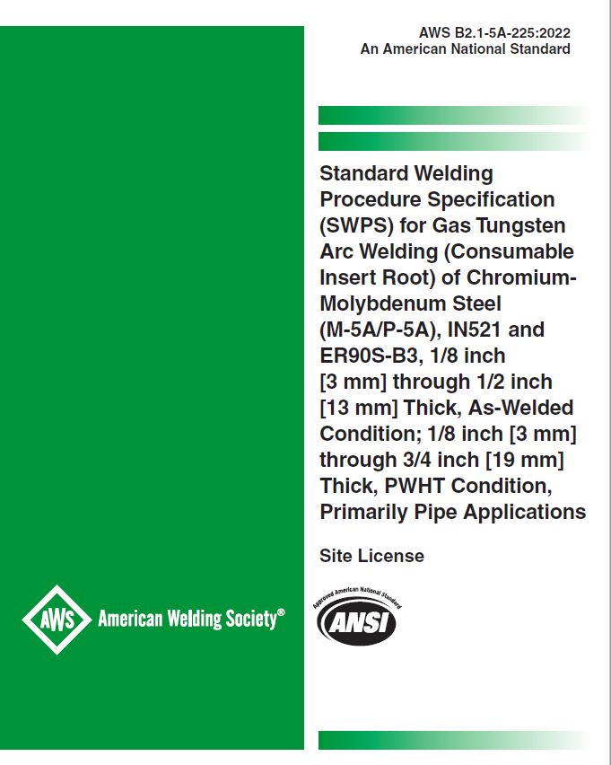 B2.1-5A-225:2022 STANDARD WELDING PROCEDURE SPEC (SWPS) FOR GAS TUNGSTEN ARC WELDING (CONSUMABLE INSERT ROOT) OF CHROMIUM-MOLYBDENUM STEEL (M-5A/P-5A), IN521 AND ER90S-B3, 1/8 IN THRU 1/2 IN THICK, AS-WELDED CONDITION; 1/8 IN THRU 3/4 IN THICK, PWHT CONDITION, PRIMARILY PIPE APP