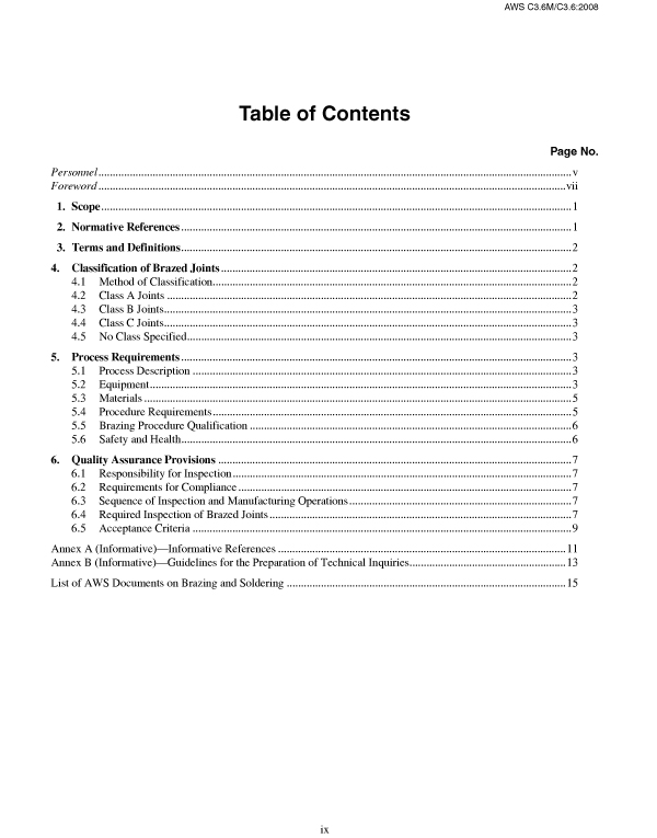 This specification provides the minimum fabrication, equipment, material, process procedure requirements, as well as inspection requirements for the furnace brazing of steels, copper, copper alloys, and heat- and corrosion-resistant alloys and other materials that can be adequately furnace brazed (the furnace brazing of aluminum alloys is addressed in AWS C3.7M/C3.7, Specification for Aluminum Brazing). This specification provides criteria for classifying furnace brazed joints based on loading and the consequences of failure and quality assurance criteria defining the limits of acceptability in each class. This specification defines acceptable furnace brazing equipment, materials, and procedures, as well as the required inspection for each class of joint. ISBN 978-0-87171-080-2\